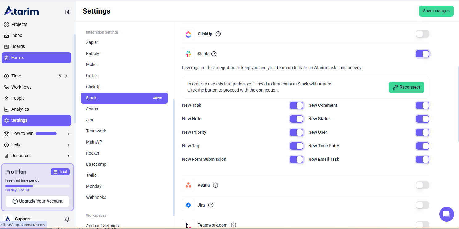 The Integrations tab provides access to external integrations such as Slack, Jira, Asana, and others, allowing you to streamline communication and task management across platforms.
