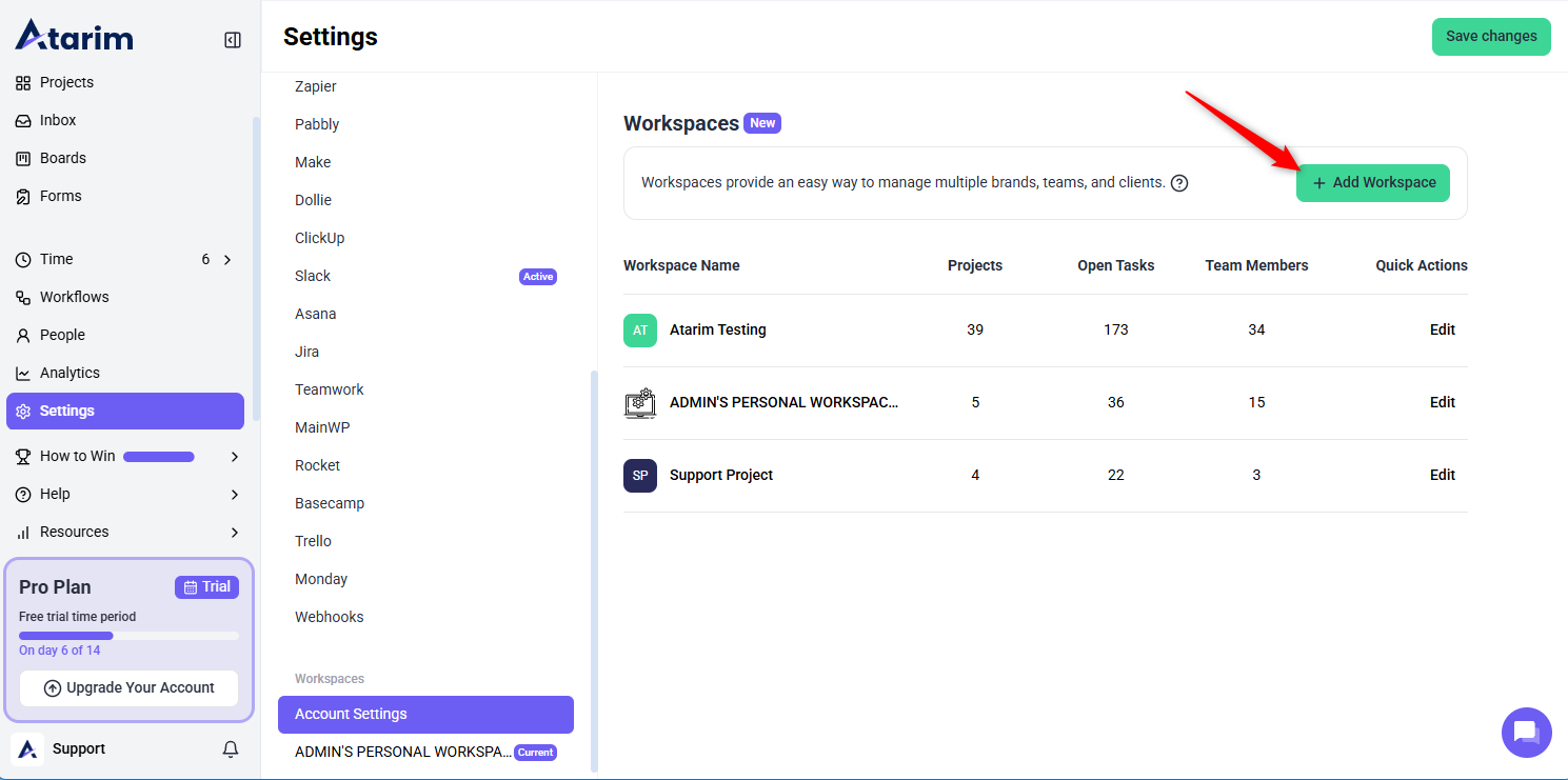 The Workspace Settings tab allows you to manage global workspace settings, including team roles, task management, and workspace-specific details.