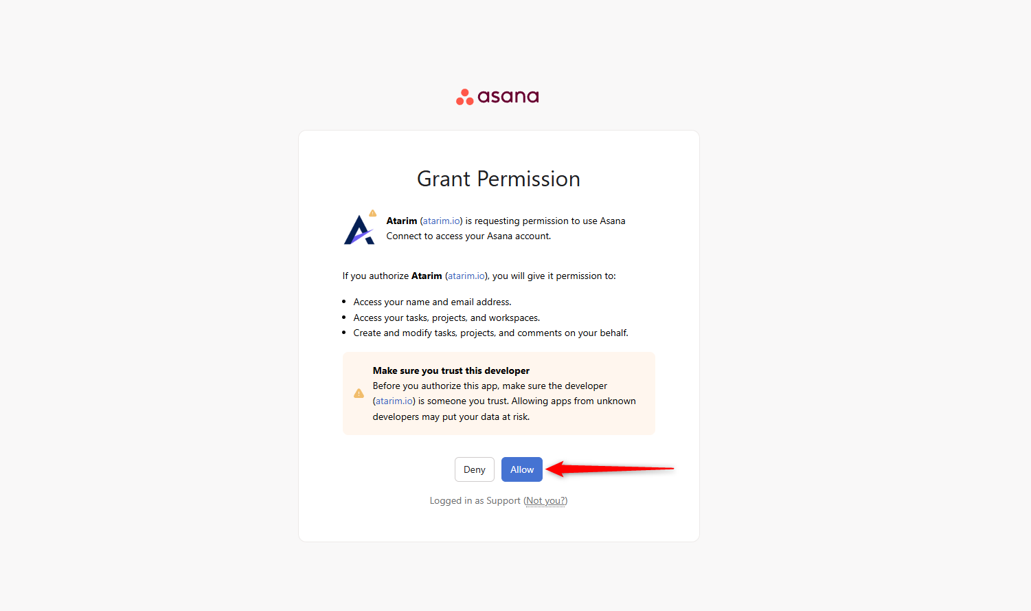 • On the permission screen, click Allow to grant Atarim access to your Asana workspace.