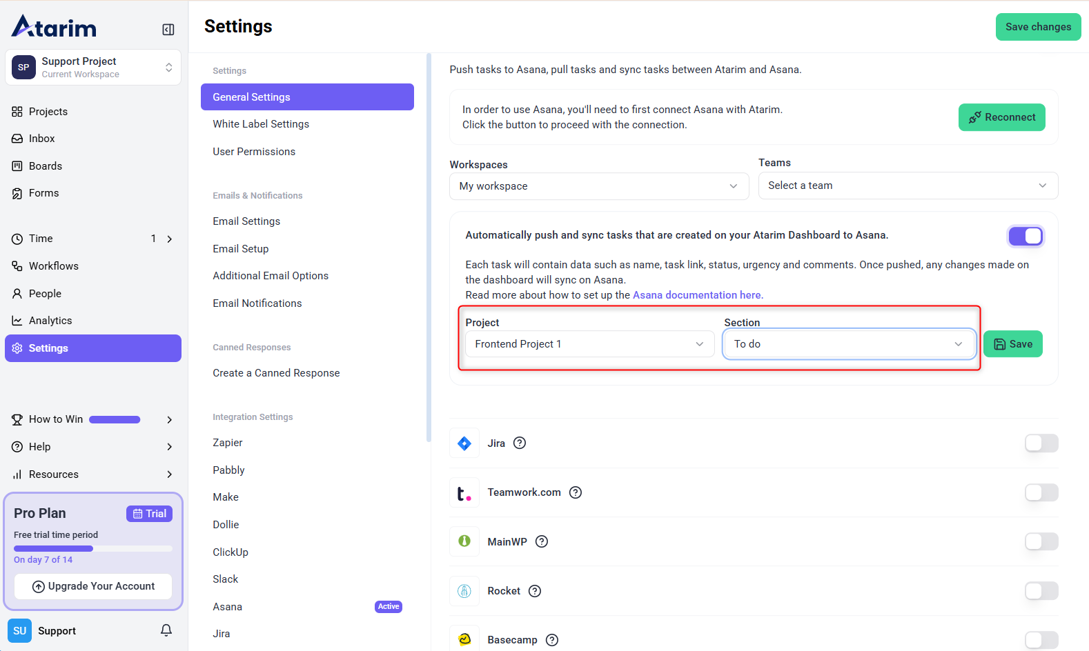 2. Choose the workspace, teams, specific project, and section where tasks from Atarim should be sent.