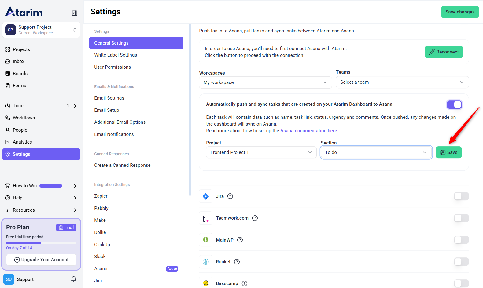 1. In the Asana Integration Settings, toggle the option to enable Automatic Task Pushing.