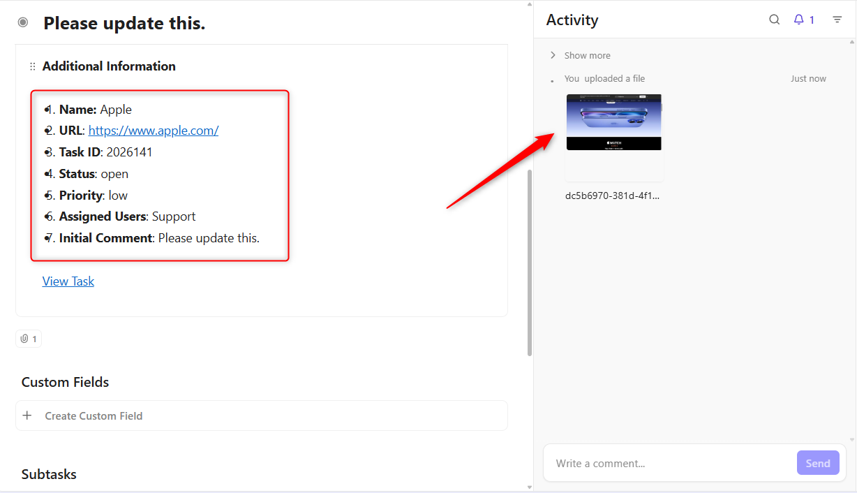Define what should happen in ClickUp once the Atarim trigger fires.