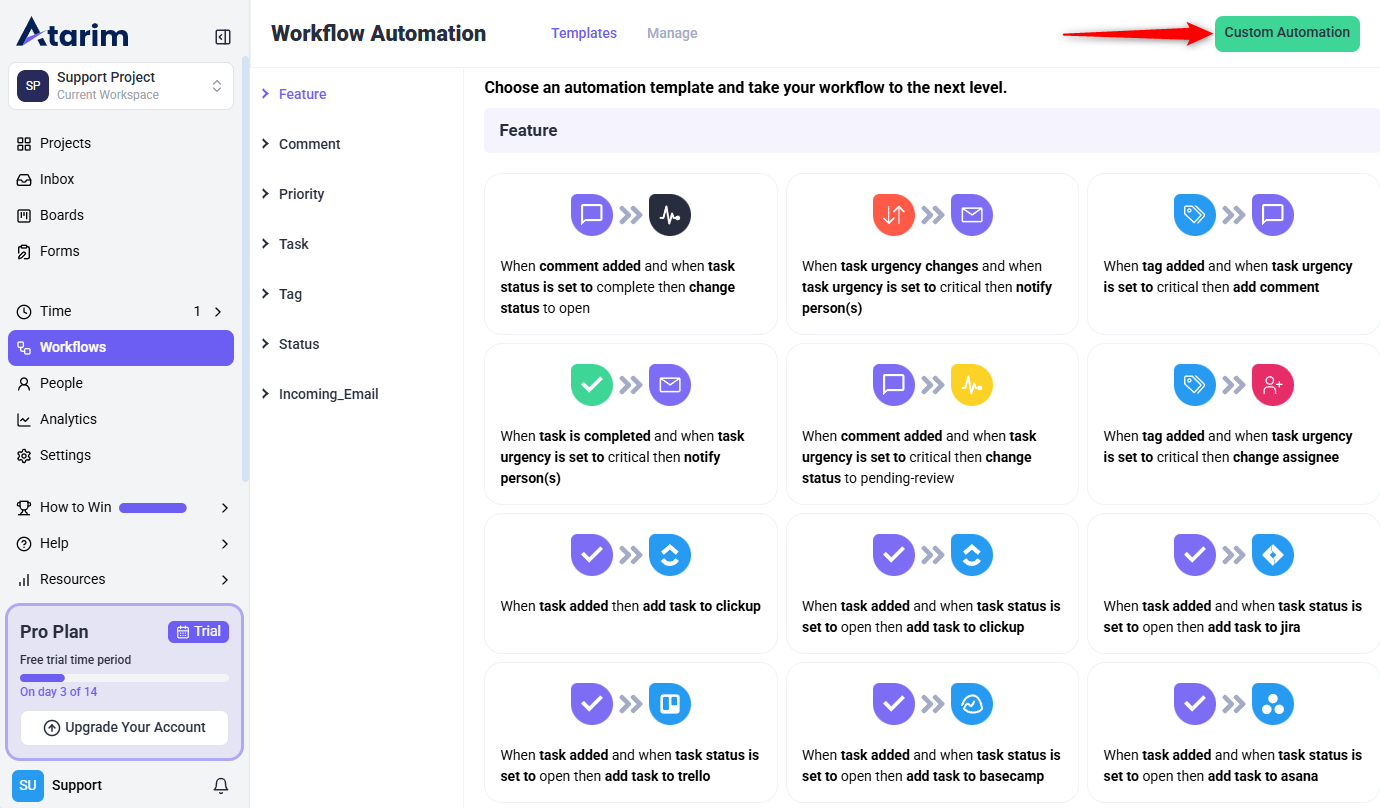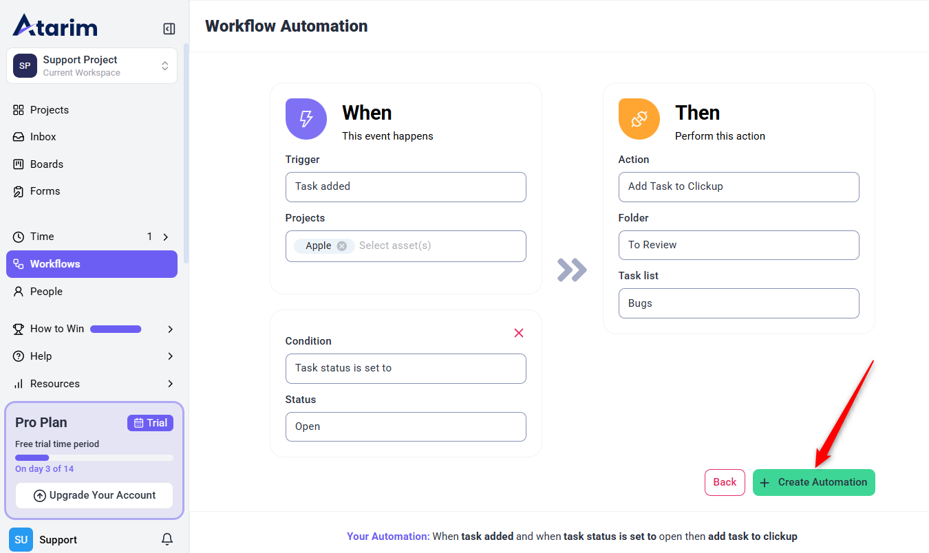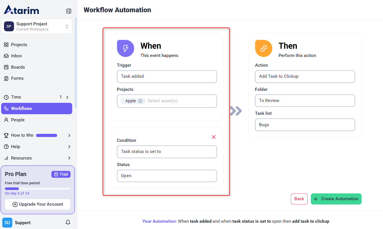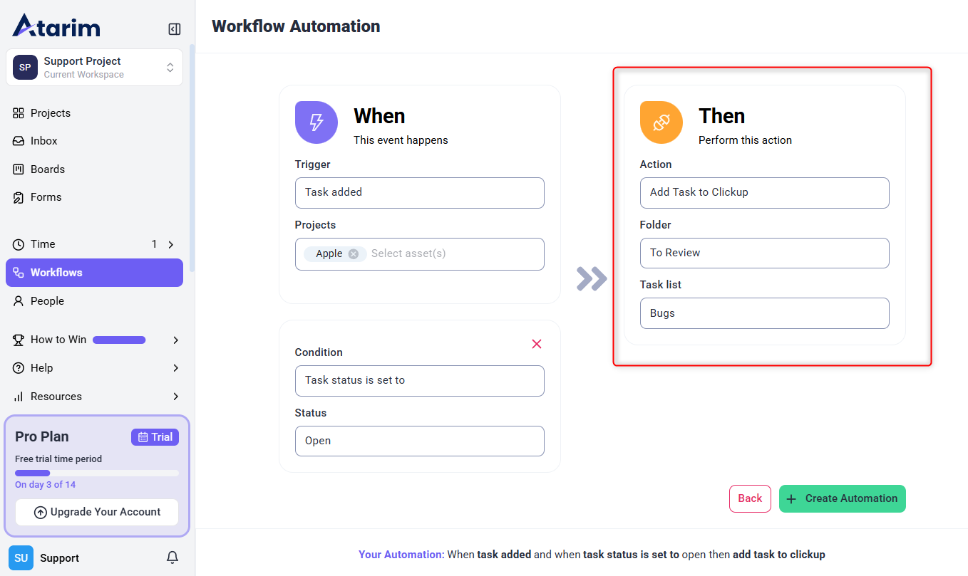 Begin building your custom “if this, then that” automation between Atarim and ClickUp.