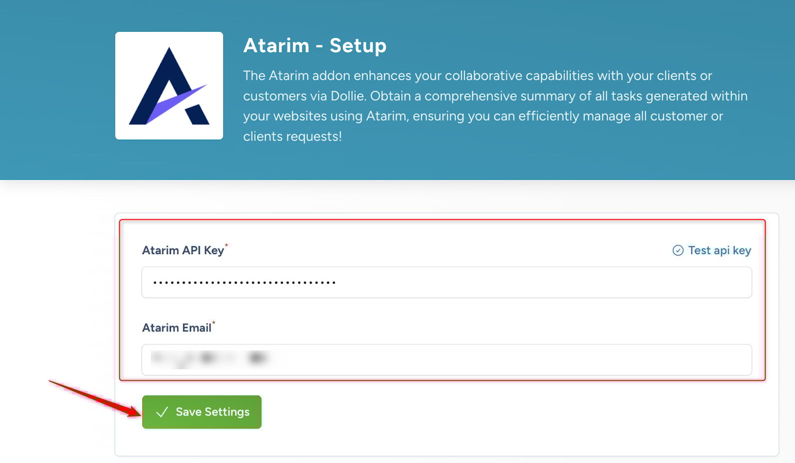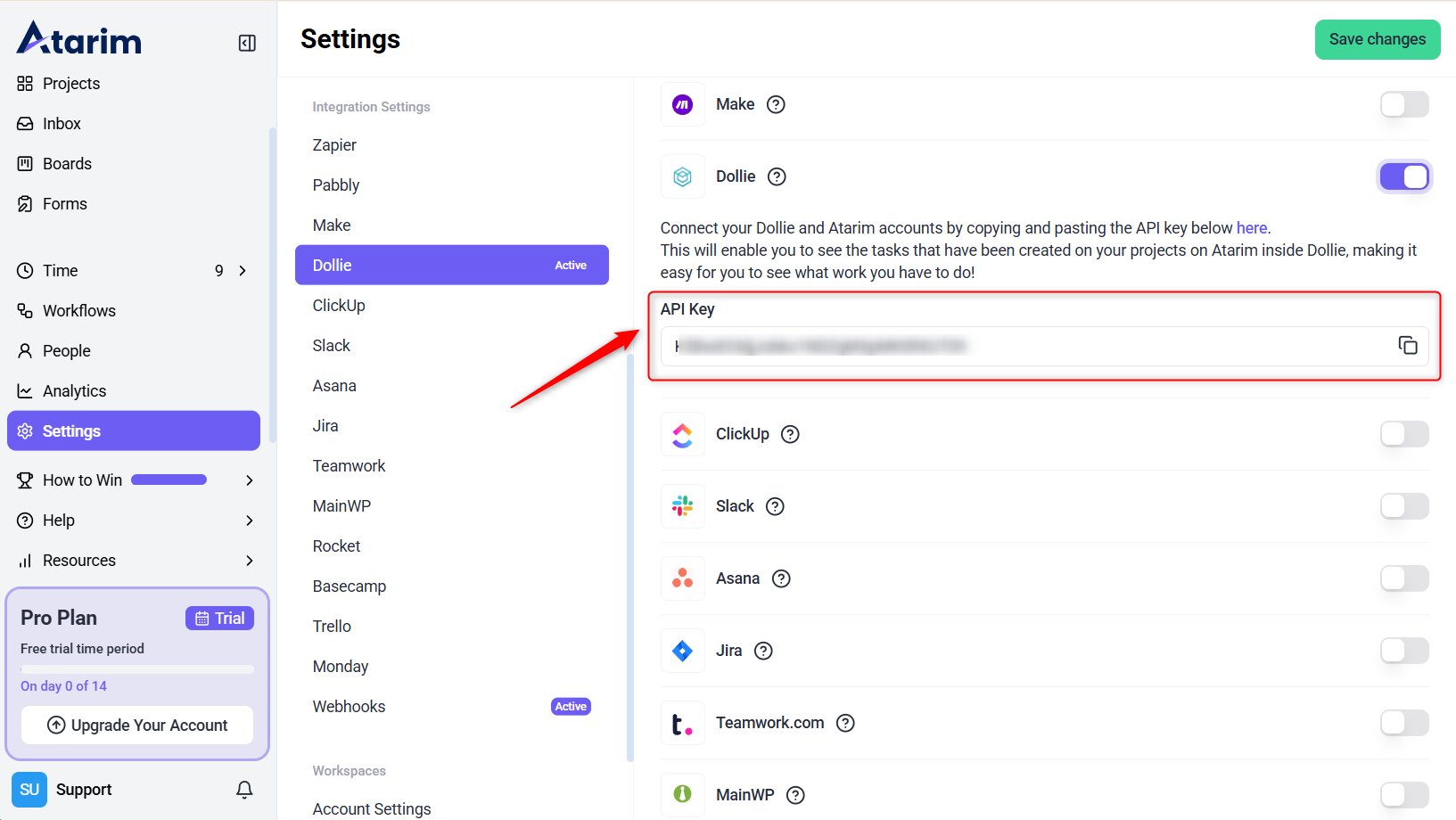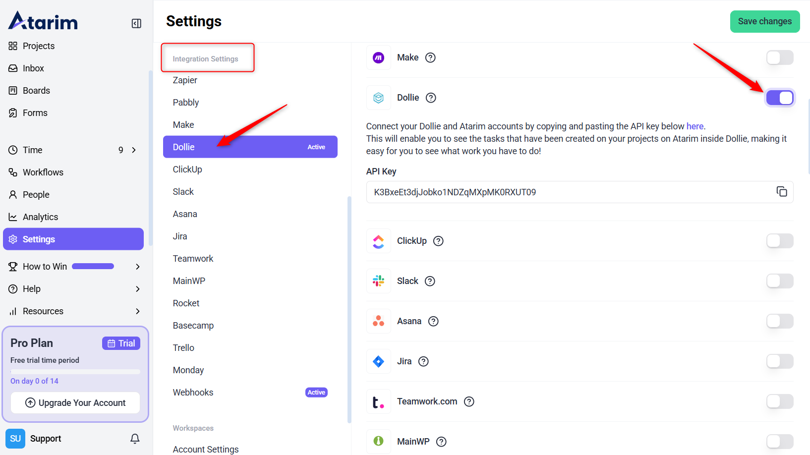 First, you’ll need to turn on the Dollie integration within your Atarim settings to generate your unique API key.