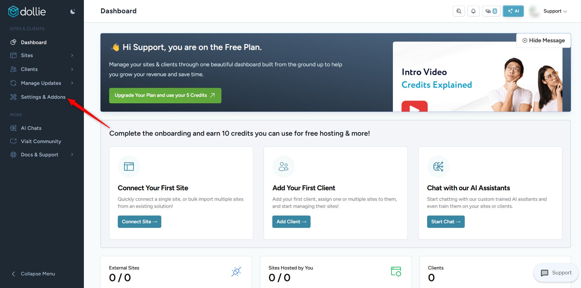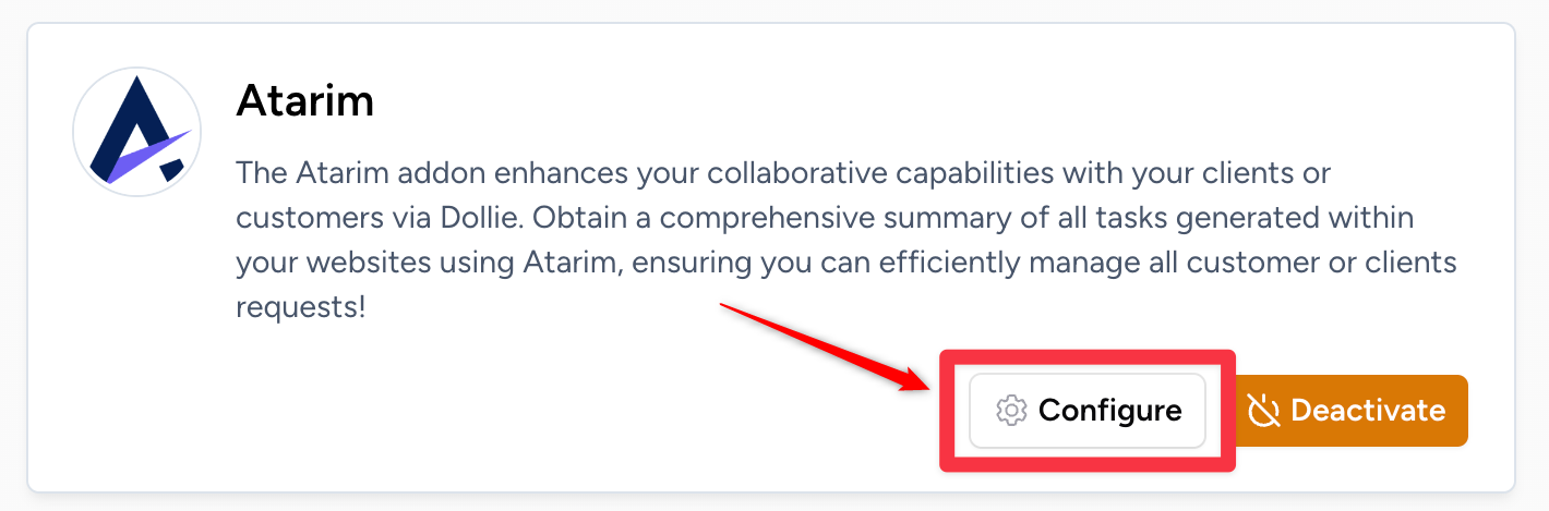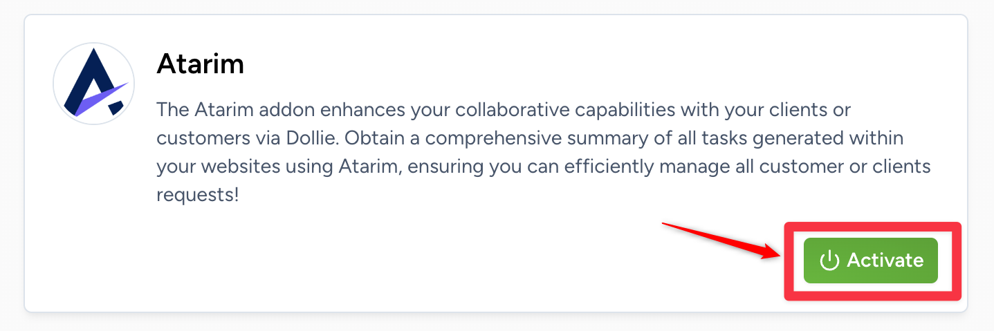 Recommendation: If you don’t see Atarim listed, confirm that your user role has permission to manage add-ons in your Dollie plan.