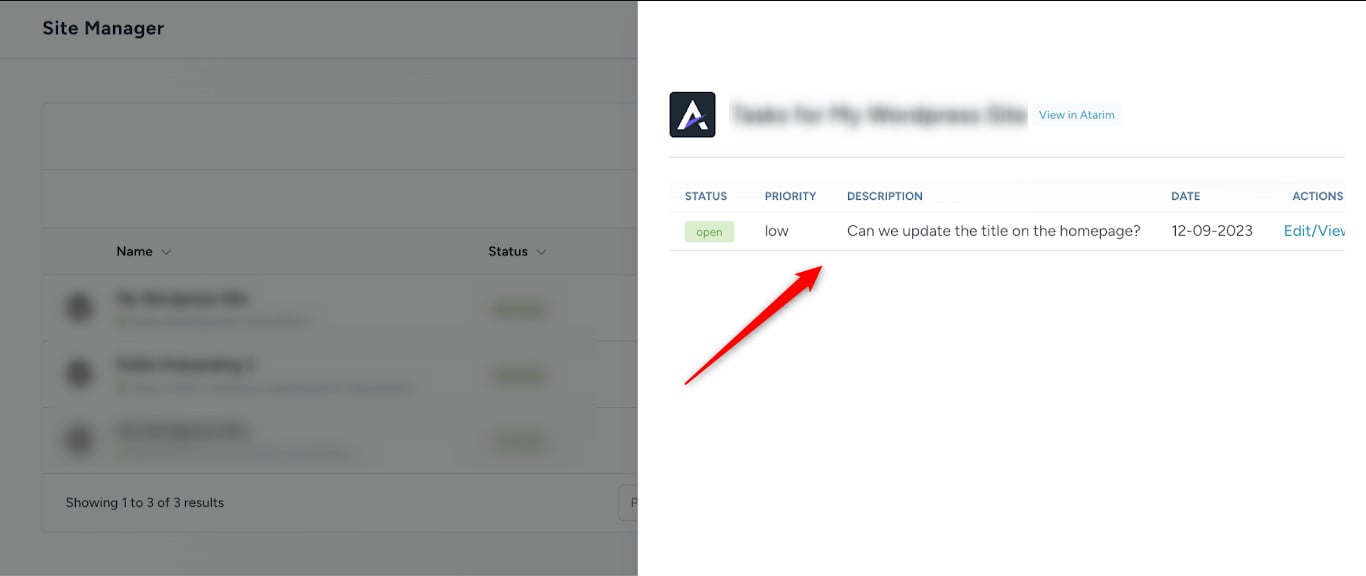 Tip: Clicking the task icon opens a side panel with all active tasks for the connected site—no need to log into Atarim separately.