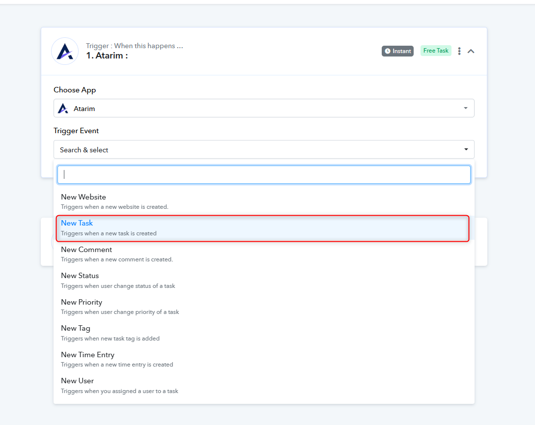 Note: This trigger activates every time a new task is created in Atarim.