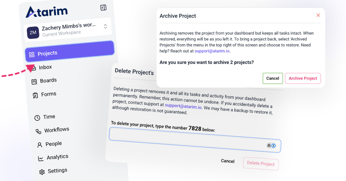 Managing dormant or completed projects effectively is crucial for maintaining a clutter-free workspace and optimizing project slots. Atarim offers tools for deleting projects, ensuring unwanted projects are permanently removed, and archiving projects, which retains data while keeping the workspace organized. This guide walks you through the best practices for managing projects based on your needs.