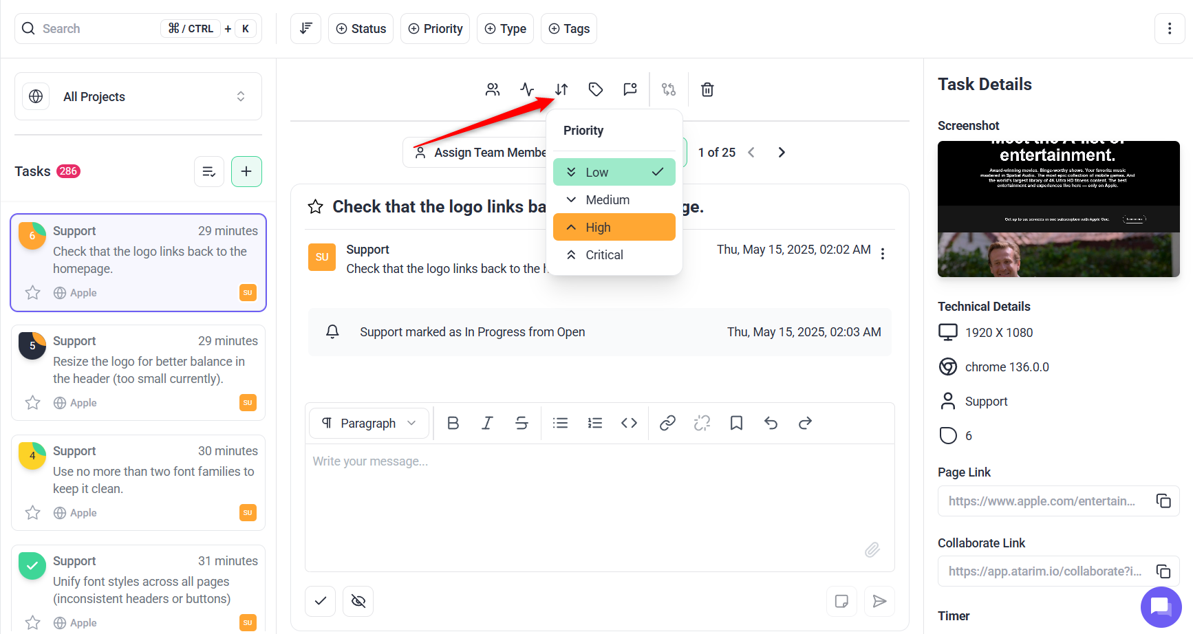 - Update priority level, and add any necessary details in the task description.