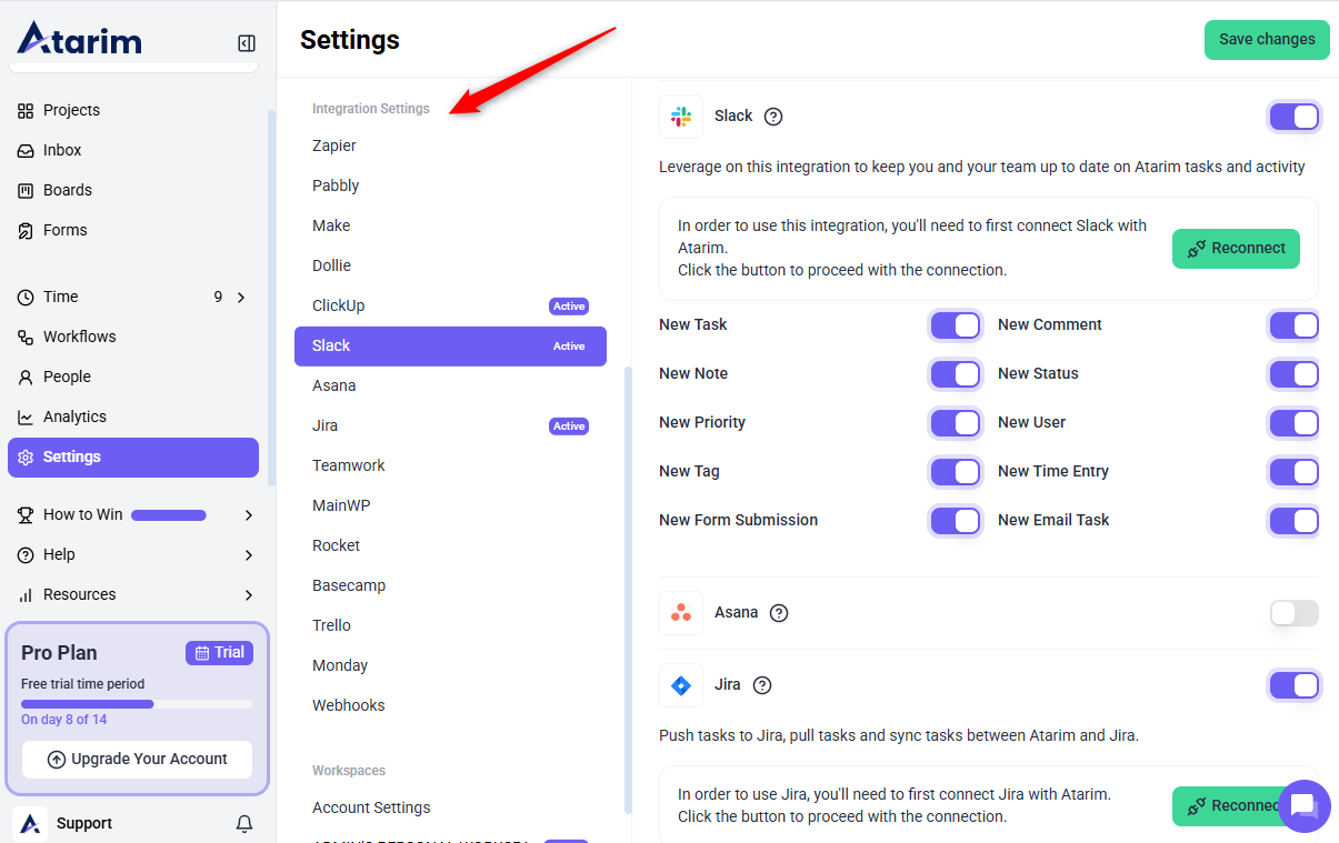 - Connect your Atarim workspace to external tools like Slack or Jira.