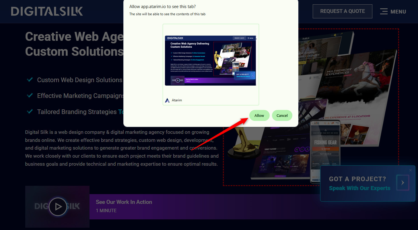 - Click Allow to grant app.atarim.io permission to view this tab and proceed with the process.